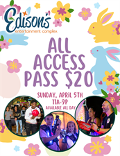 Easter Sunday @ Edison's! $20 All Access Pass available ALL DAY from 11a-9p. Includes 1 hour of bowling, unlimited laser tag and timed arcade for 3 HR's.